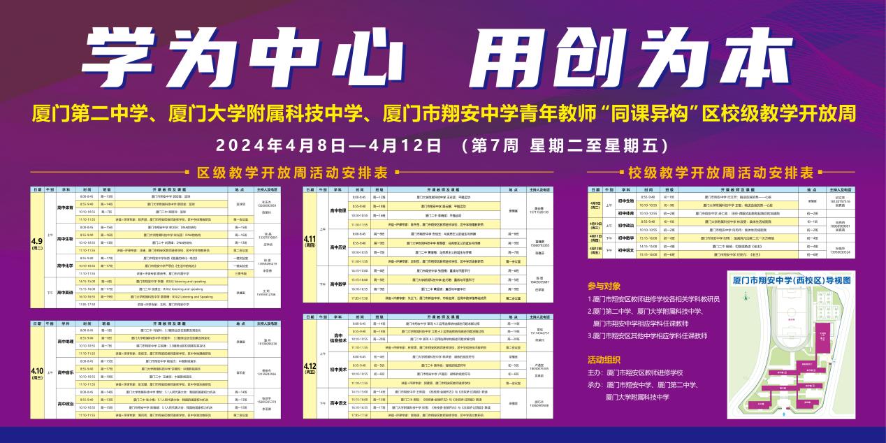 为加强校际教育教学的互学互鉴,进一步推动岛内外教育一体化均衡发展,4月9日至4月12日,我校与科技中学、翔安中学共同举办主题为“学为中心,用创为本”的开放周活动,我校共选派13位优秀青年教师、涉及12门科目,积极参与公开课展示活动,共同探讨新课标背景下课堂教学改革的实践方向,以解决课堂问题为抓手,推动教学走向深入。